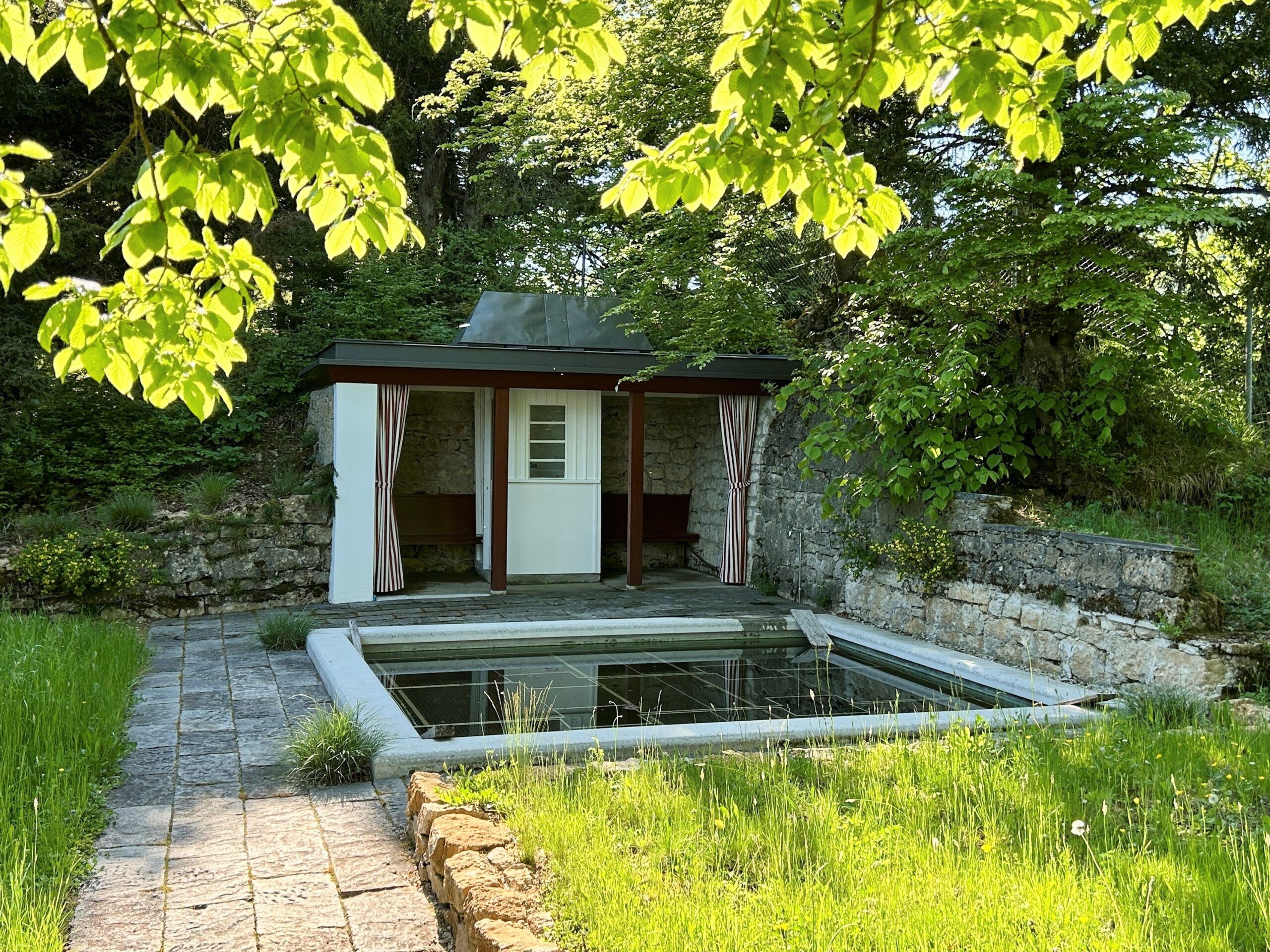 Die verborgene Anlage auf dem Felssporn gewährte den Schlossbewohnern das gewünschte Mass an Privatheit. Heute zählt der 2021-2023 restaurierte Badegarten mit dem alten, geschützten Baumensemble aus Eiche, Eibe und Buche im Osten zu den besonderen Attraktionen von Wartenfels. Das Becken ist aus Sicherheitsgründen mit einem Gitter versehen und dient Seerosen, Erdkröten und Molchen als Lebensraum.
